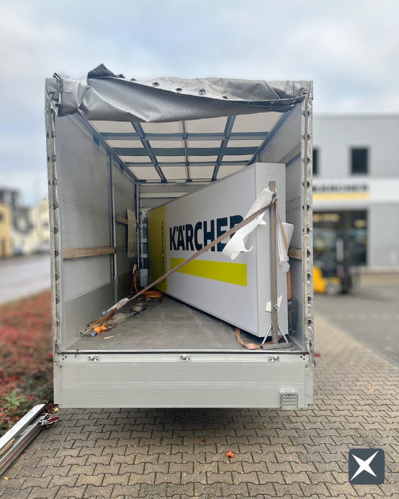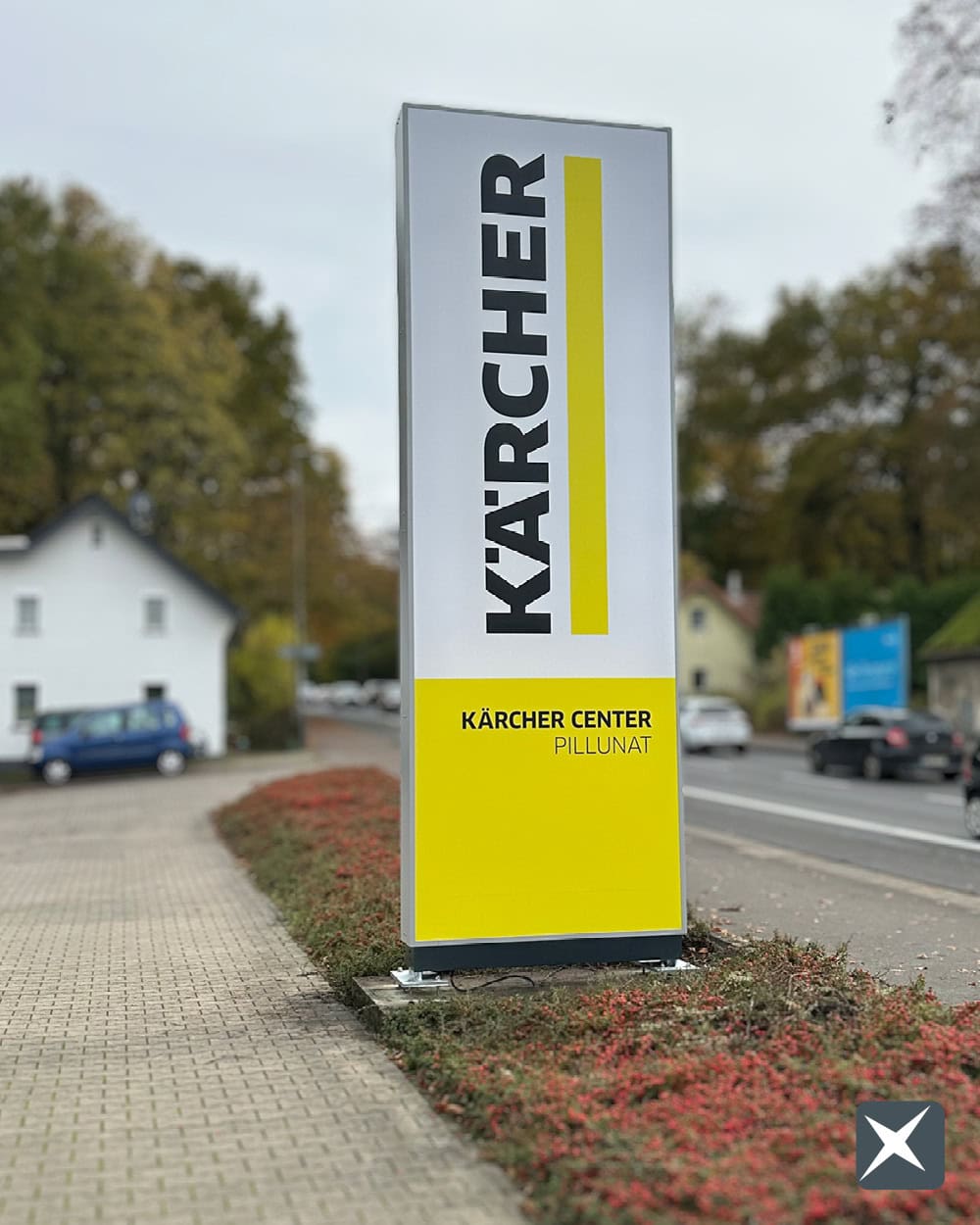 Mit einem rund 5 Meter hohen Spanntuchpylon erhält das Kärcher Center Pillunat in Bergisch Gladbach eine weithin sichtbare Markenkennzeichnung. Direkt an der Bensberger Straße positioniert, weist der neue Werbepylon Kunden zuverlässig den Weg zum Standort.