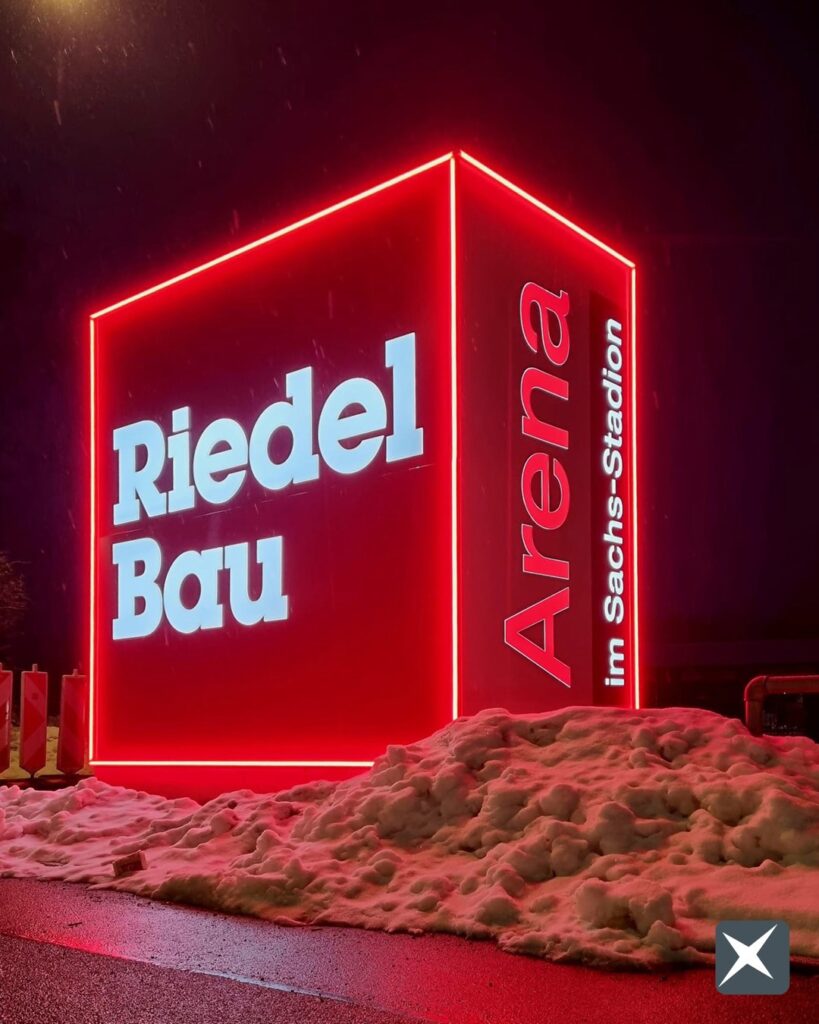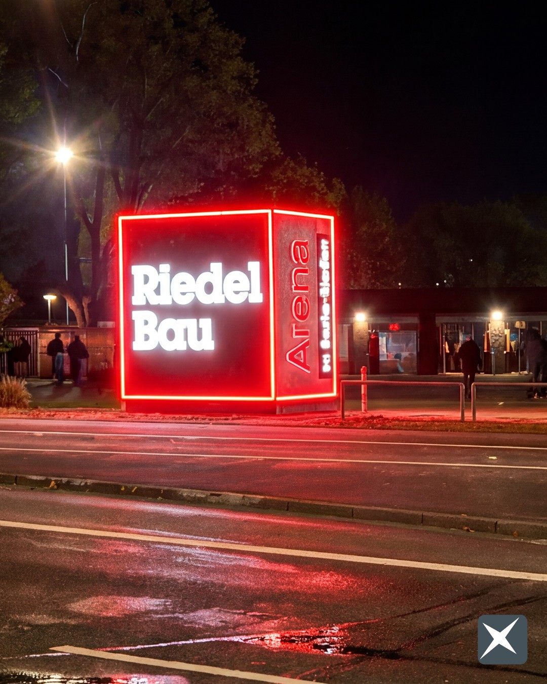So entstand eine individuelle Werbeanlage mit starker Fernwirkung, klarer Formsprache und prägnanter Lichtinszenierung – ein unverwechselbares Markenzeichen für den Standort von RIEDEL BAU.