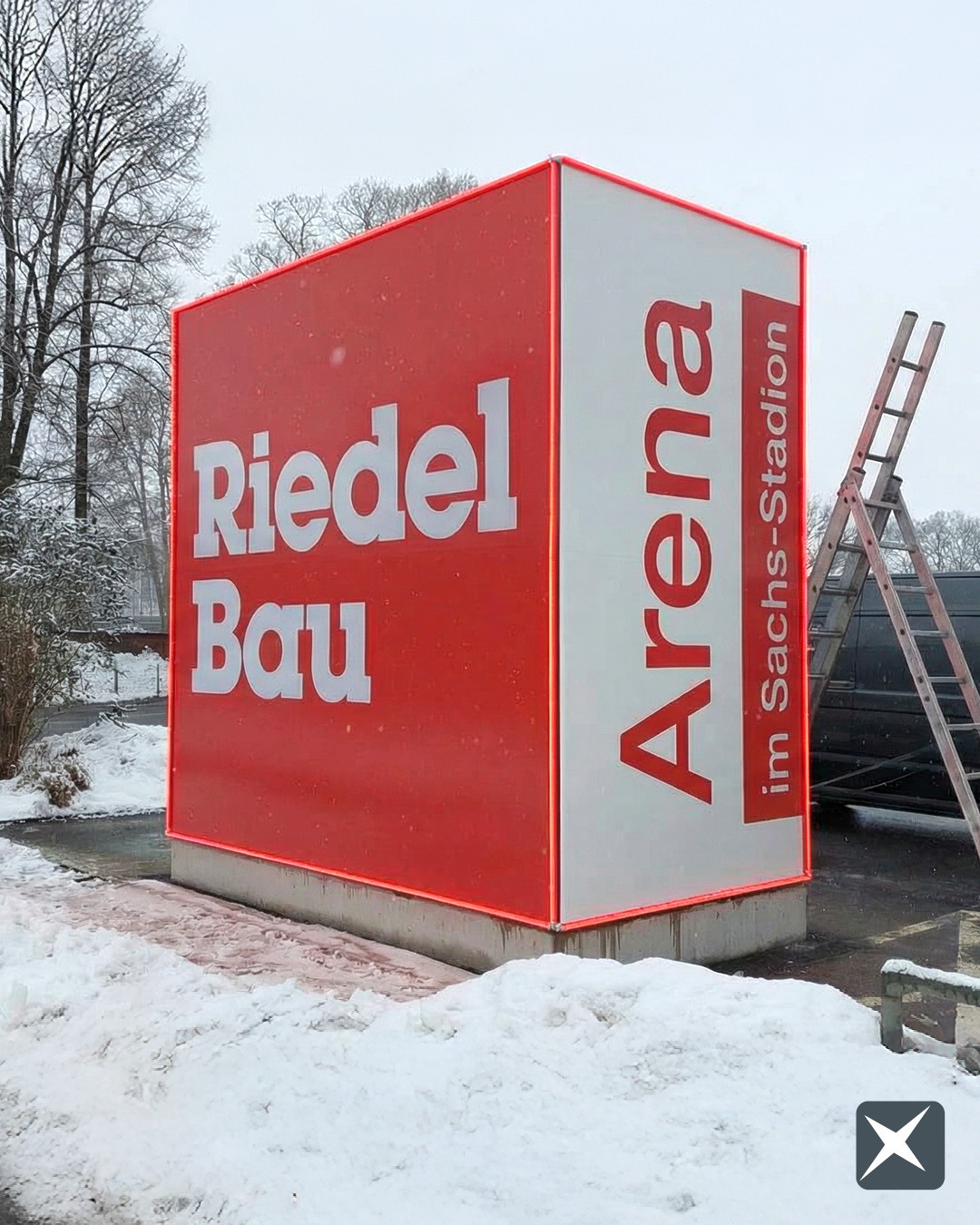 Für den Standort FC Schweinfurt von RIEDEL BAU durften wir eine markante Werbestele im Sonderformat realisieren. Die Anlage wurde als L-förmige Konstruktion konzipiert und hat ein Format von etwa 4.000 × 4.000 × 2.000 mm – ein prägnantes Gestaltungselement, das bereits aus der Distanz Aufmerksamkeit erzeugt und die Marke klar im Raum positioniert.
